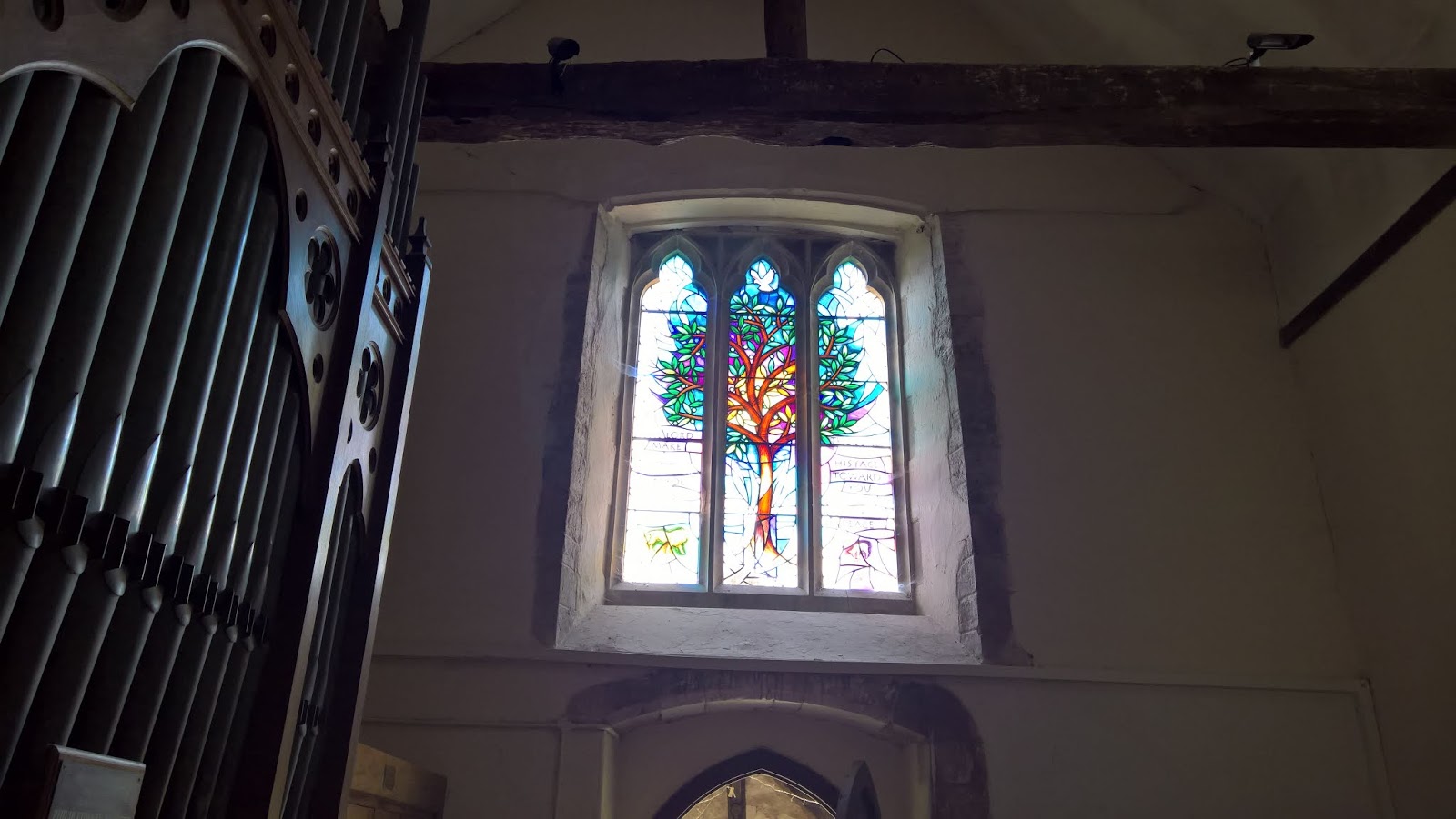 A church which is alive enough to be able to commission some new glass. At least that is what we thought, but reference 2 says late 19th century - which had seemed a bit unlikely from the style of the thing - but zoom suggests that a lot of the white around the tree was once coloured - with loss of colour seeming to be common in 19th century glass.